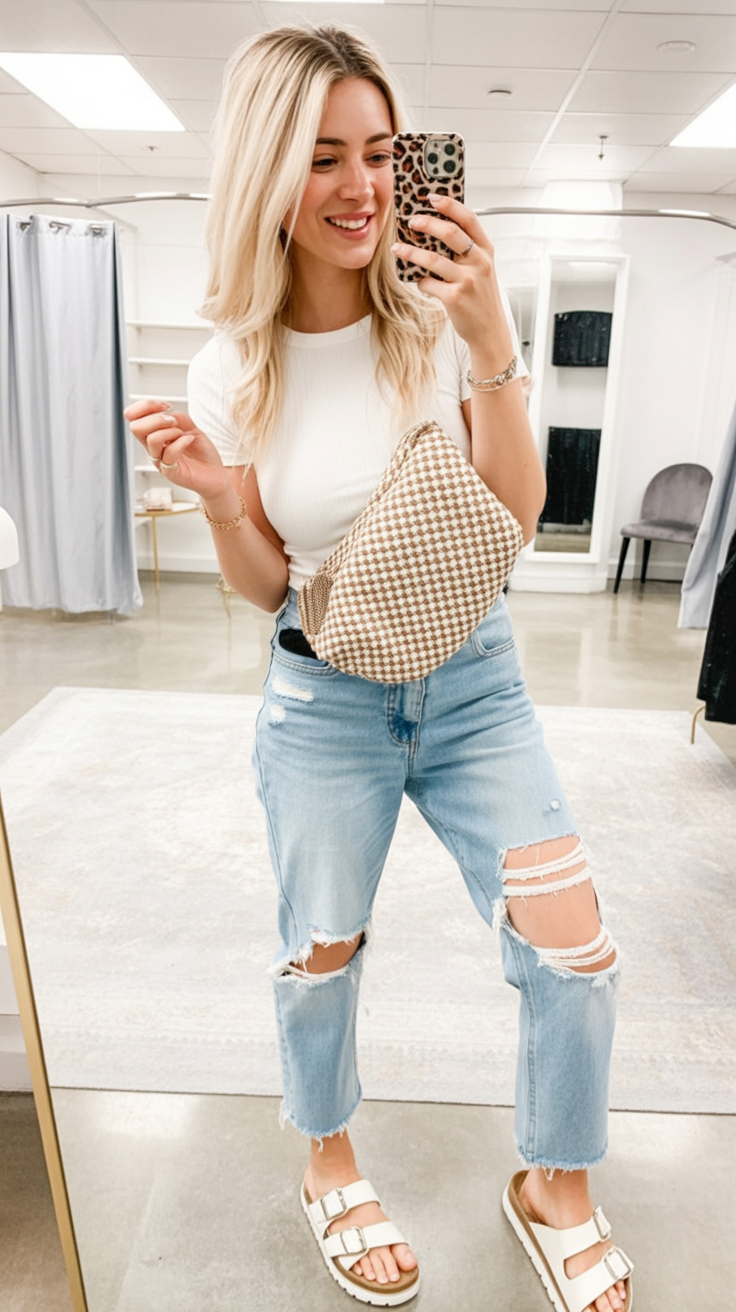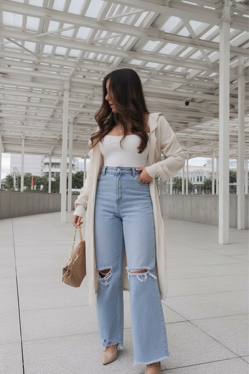 This look feels confident, playful, and unapologetically feminine. The off-shoulder top adds softness, while the ripped denim keeps it real and grounded. It’s flirty without being over-the-top, perfect for spring days when you want to feel seen.