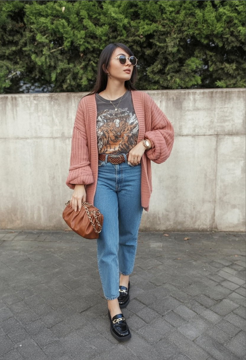This outfit feels relaxed and personal, like a favorite playlist or a well-loved book. The graphic tee adds character, while the cardigan softens the look and makes it feel approachable. It’s casual, warm, and full of personality.