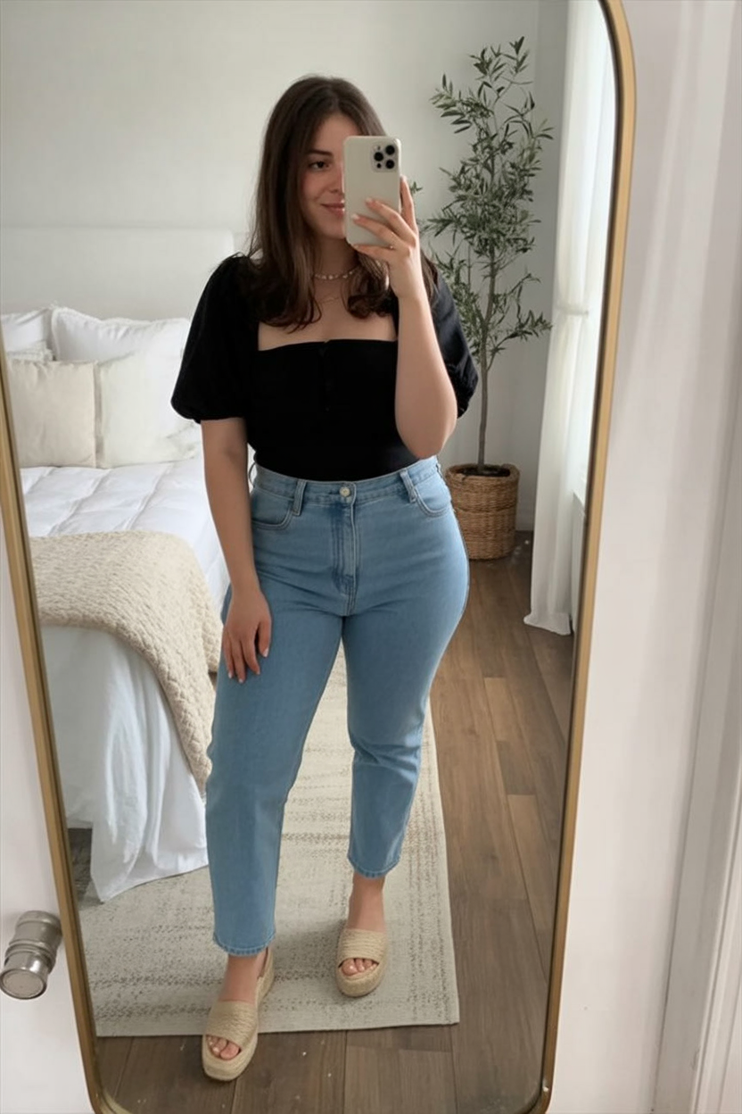 The emotional payoff here is confidence. This outfit is especially empowering for midsize and plus-size women who want denim that celebrates curves instead of hiding them. It’s cute, strong, and perfect for casual plans where you still want to feel special.