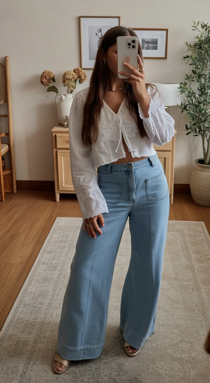 This look feels romantic but grounded. The light layers move beautifully and give that airy spring feeling, while the wide-leg jeans keep it modern and strong. It’s the kind of outfit that feels thoughtful without being fussy, perfect for days when you want to feel feminine but still very real.