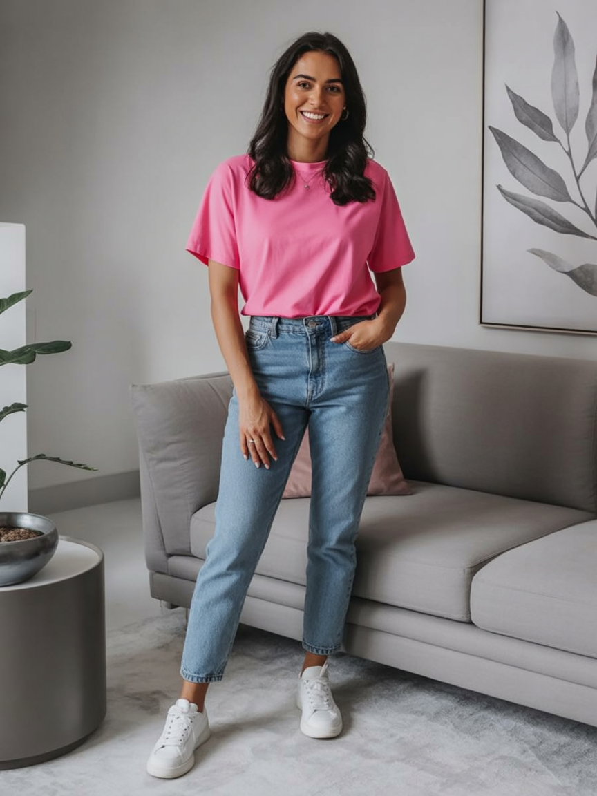 There’s something so joyful about a soft pink tee with classic jeans—it feels warm, friendly, and approachable. This look has that lived-in comfort that still feels fresh, perfect for spring days spent moving between home, errands, and casual plans. It’s relaxed without looking sloppy, and honestly, it just makes you smile.