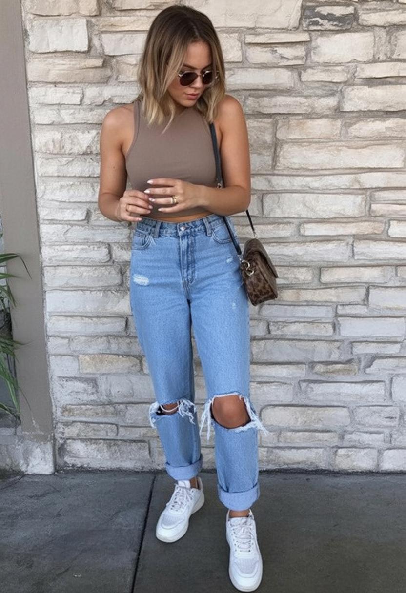 The vibe here is bold but wearable. This outfit works best with sneakers for a fully casual feel, making it great for walking-heavy days or travel. It’s an easy win for women who love denim with personality and want ideas that feel youthful without feeling young.