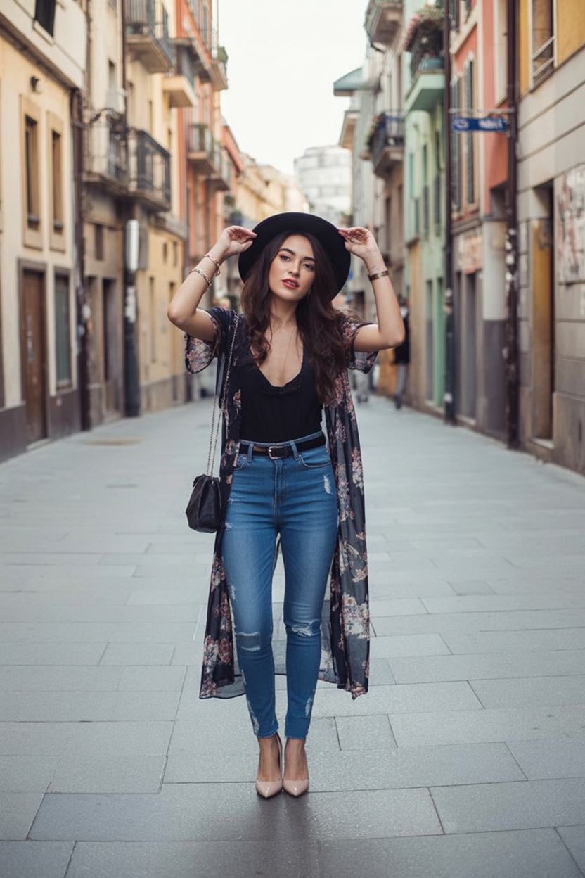 This look is full of flow, drama, and elements to show off your personality. The draped layer on top of classic denim is immediately interesting, and it makes the outfit feel styled rather than thrown together. It’s the sort of ensemble that makes you lean in a little—soft, self-assured, and eloquent.