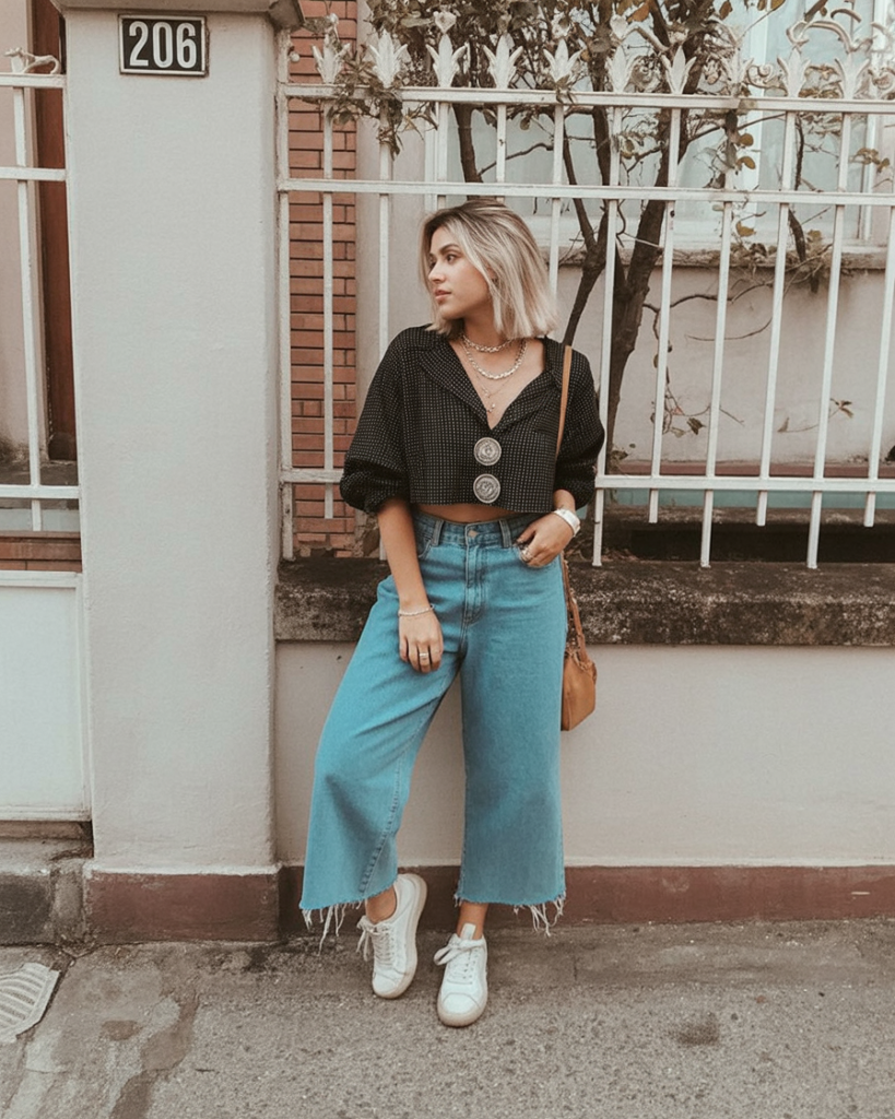 This look is creative and personal. The cropped top and wide-leg jeans contribute a bit of fashion-editor energy to life. It’s laid back and cool and ideal for the woman who wants to feel considered but also very, very easy.