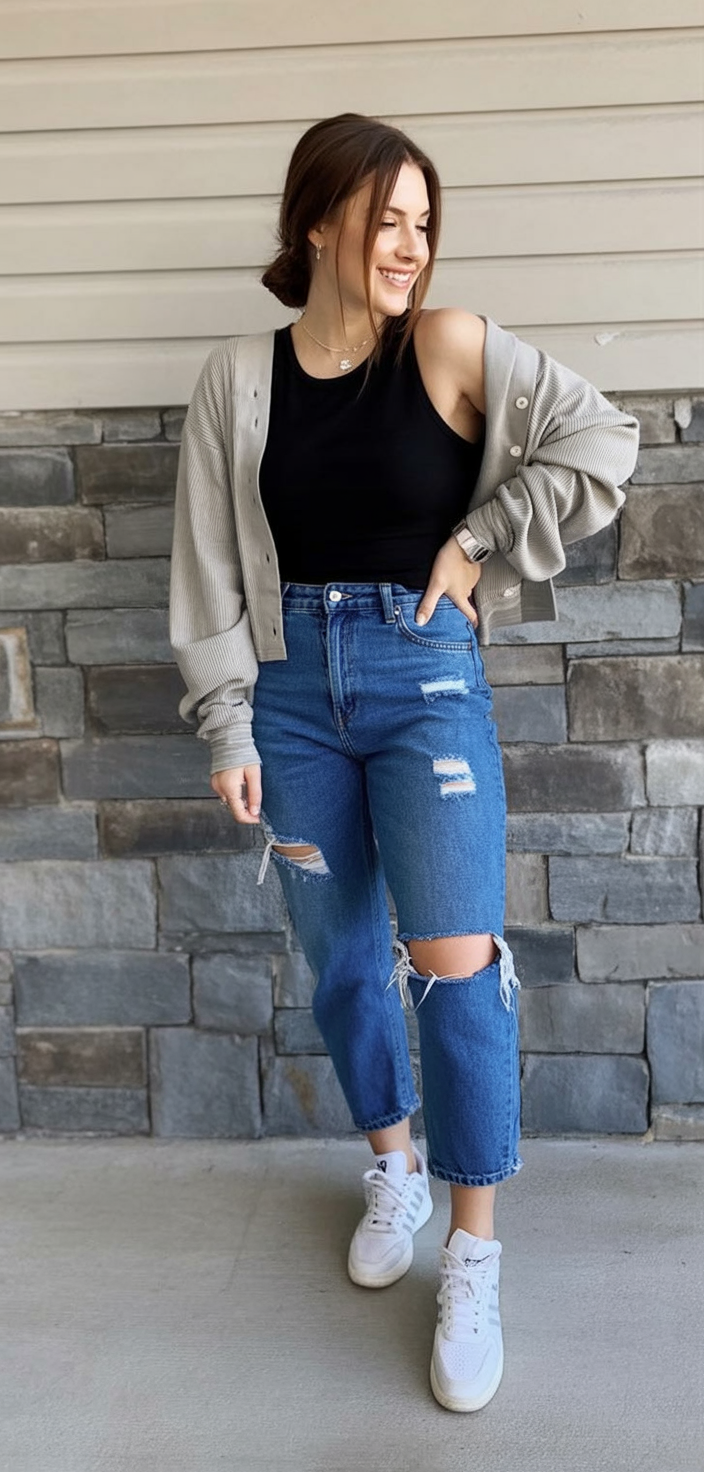 21. Black Tank with Cropped Cardigan and Ripped Jeans