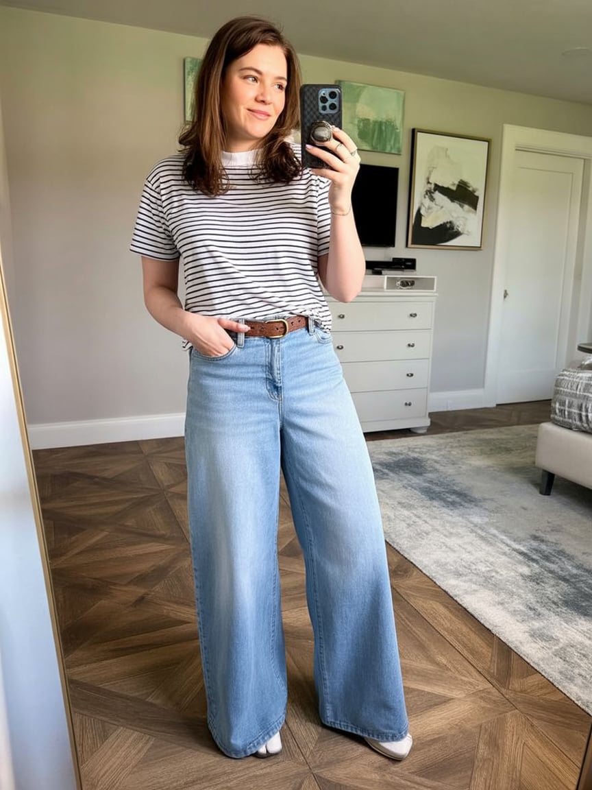 This combination is timeless and confident. The striped tee adds a classic element, while the wide-leg jeans make it perfect for 2026. It’s easy, polished, and so wearable—one of those outfits you can count on every time.