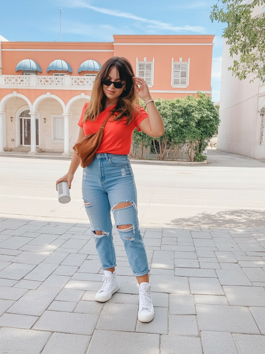 This look has attitude—in a fun, confident way. The red tee pops against the denim and gives off that casual-style baddie vibe without trying too hard. It feels playful, a little rebellious, and perfect for sunny spring days when you want your outfit to match your mood.