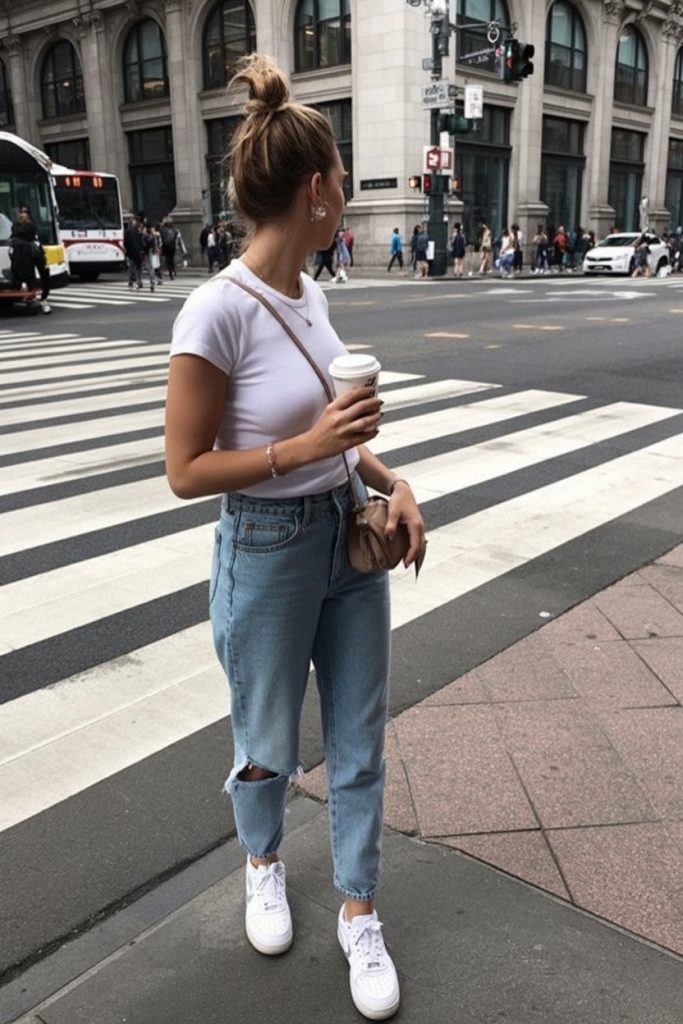 This is city life in a look! The white tee, relaxed denim, and sneakers look practical, confident, and real. It’s the type of outfit you can throw on without thinking—and still feel good in all day.