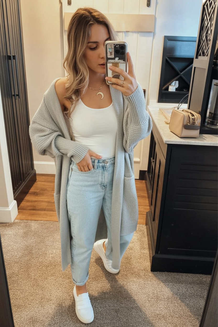 19. Cozy Cardigan with Graphic Tee and Jeans