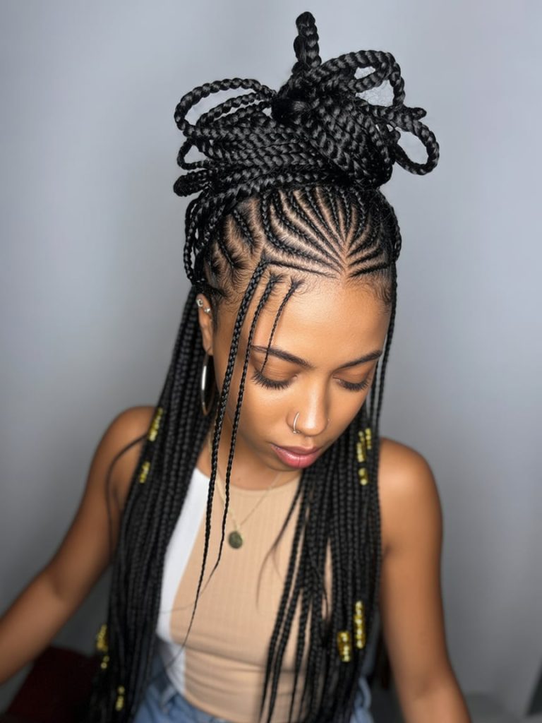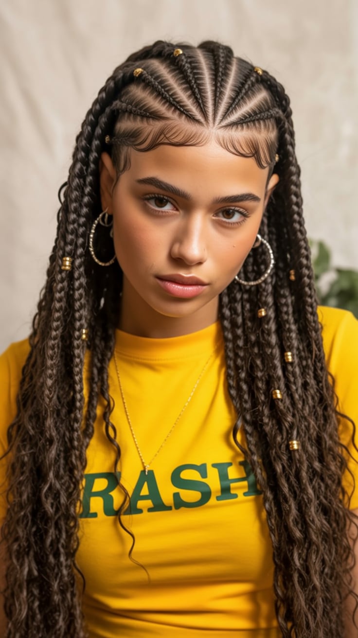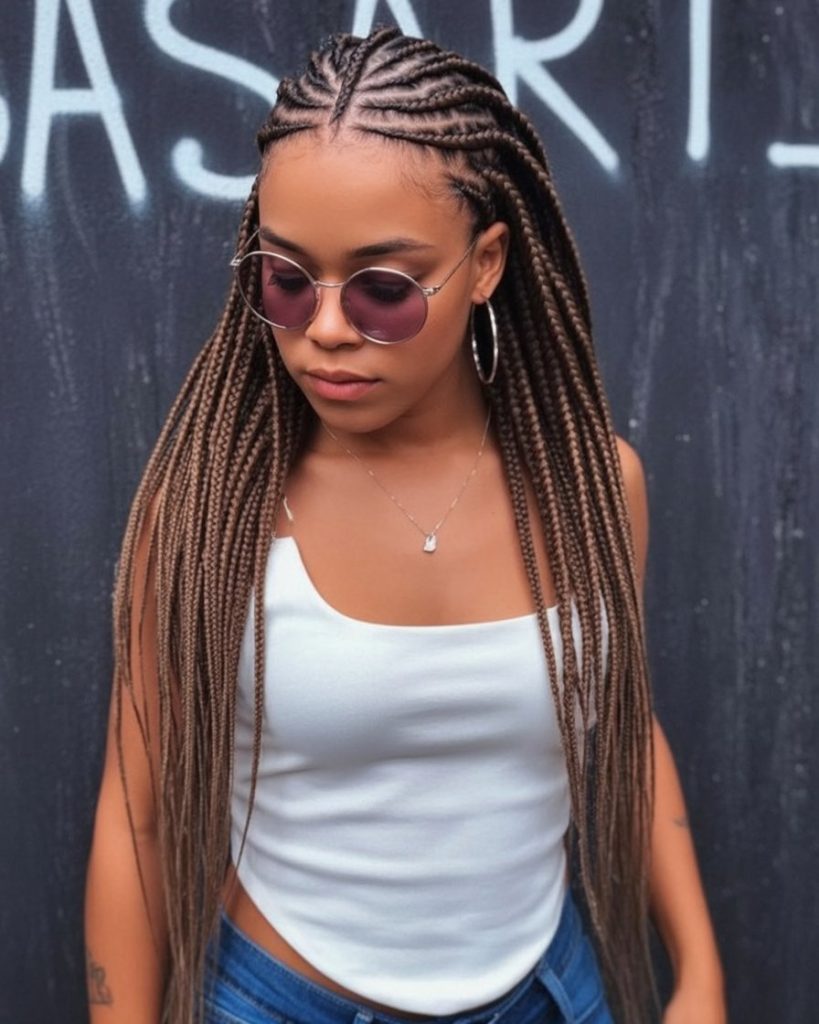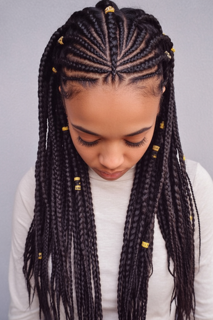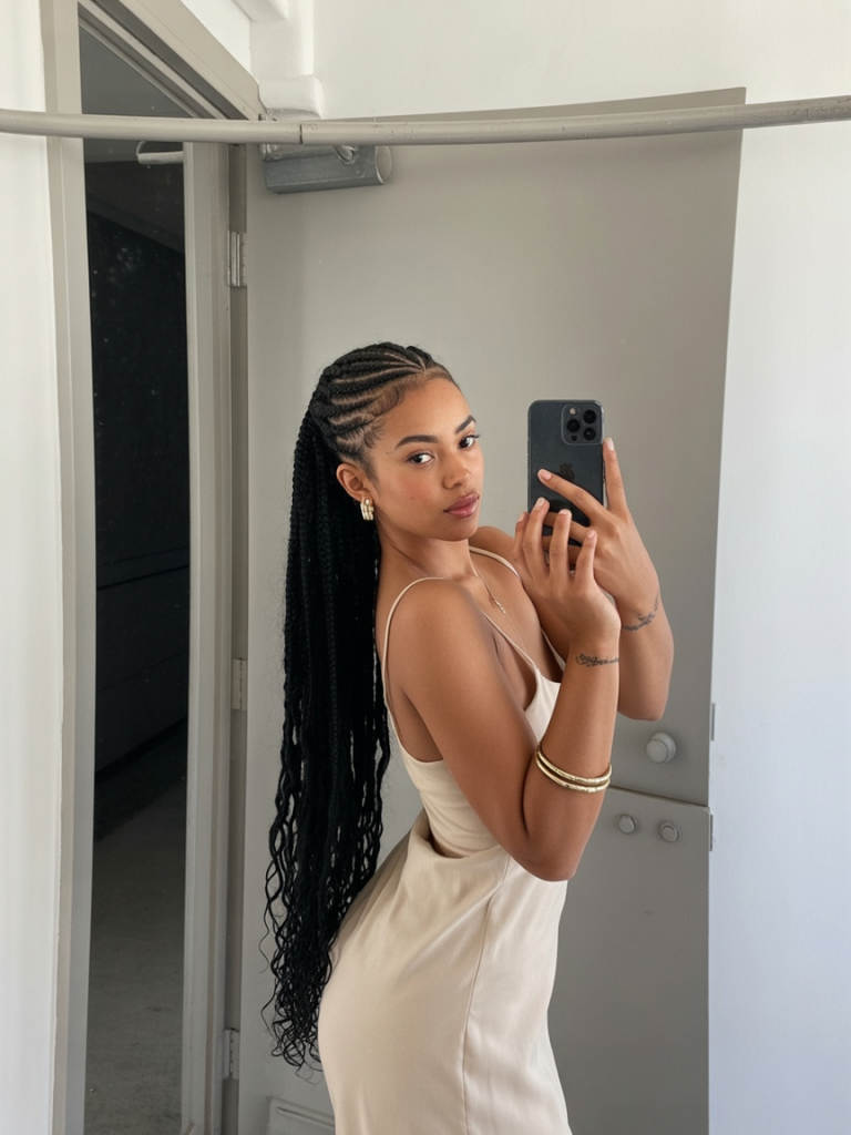 What to wear it with: warm blush, gold hoops, and a square-neck top to echo the lines of the braids. The accessories do the talking, so let the makeup stay soft. If you’re adding color with beads, choose two tones for depth and keep patterns cohesive from front to back.