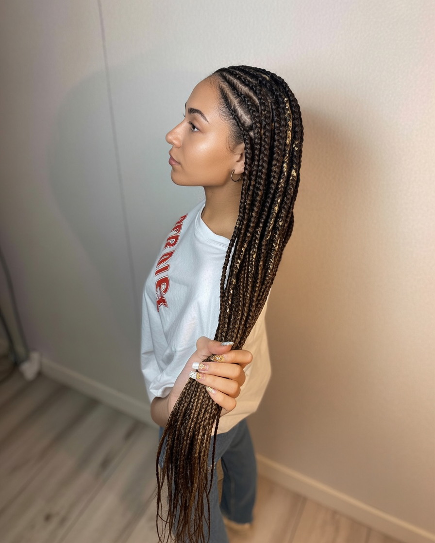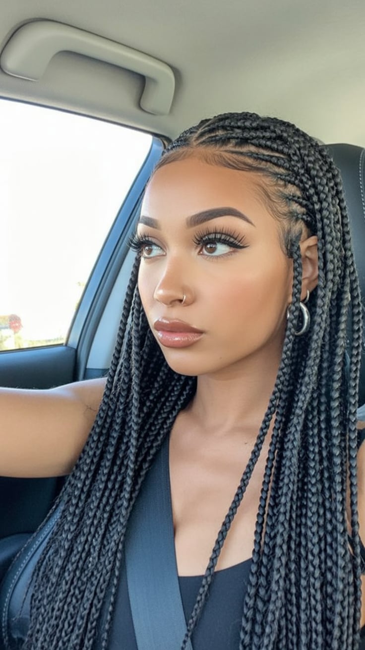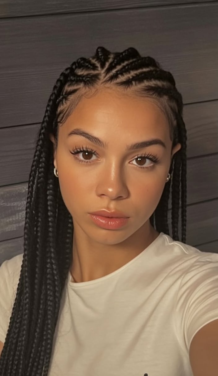 From running errands to evening plans, these glossy braids look seamless and chic in every setting. The parting is immaculate, and the lengths are long and uniform, with the hairline softly detailed, making for a simple and clean aesthetic that instantly boosts confidence. It’s a street-style take on a classic that photographs beautifully from every angle.