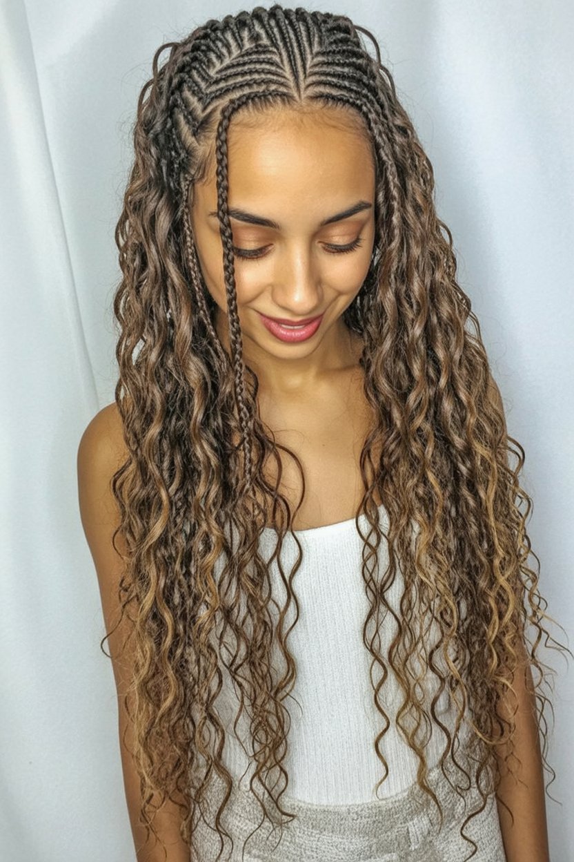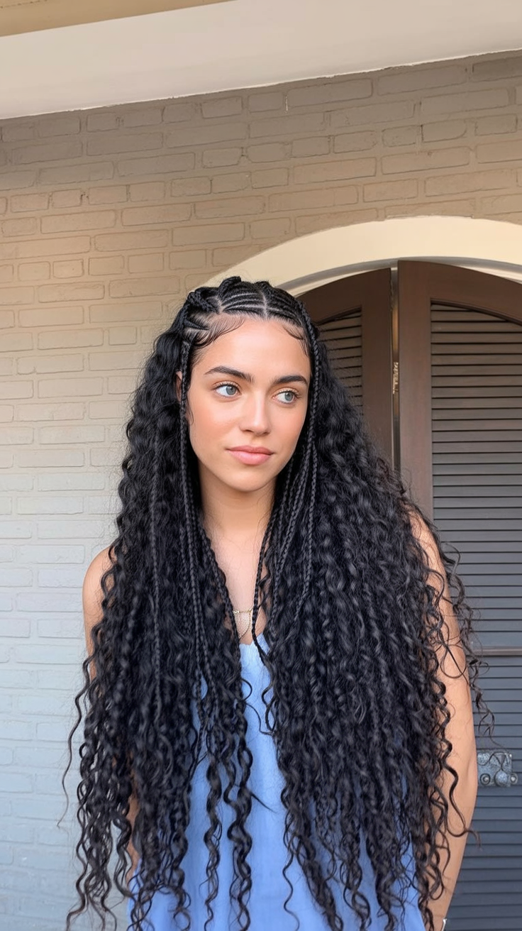 The combination of tight scalp work and gently loose, sea-salt waves is summery in a breezy, touchable, and effortlessly cute way. The crown has artisan-style patterning, and the lengths tumble with curls for a soft, romantic finish. It’s a lovely nod to Boho without going all the way to a full festival.