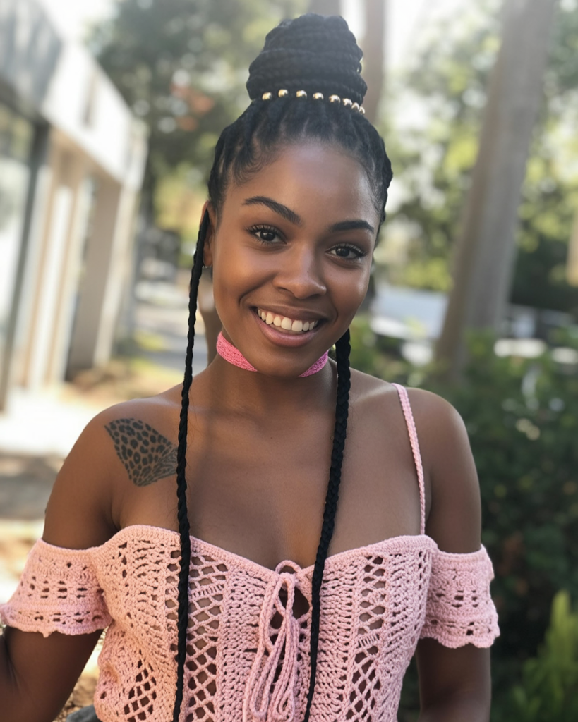All eyes up: a structured topknot shows off the scalp art, while slim face tendrils soften the look. Beads dot the base like a tiny tiara—beads that add rhythm with every step. It’s playful, flirty, and totally simple to dress up or down. Brunch on Saturday, rooftop on Sunday—same style, new outfit.