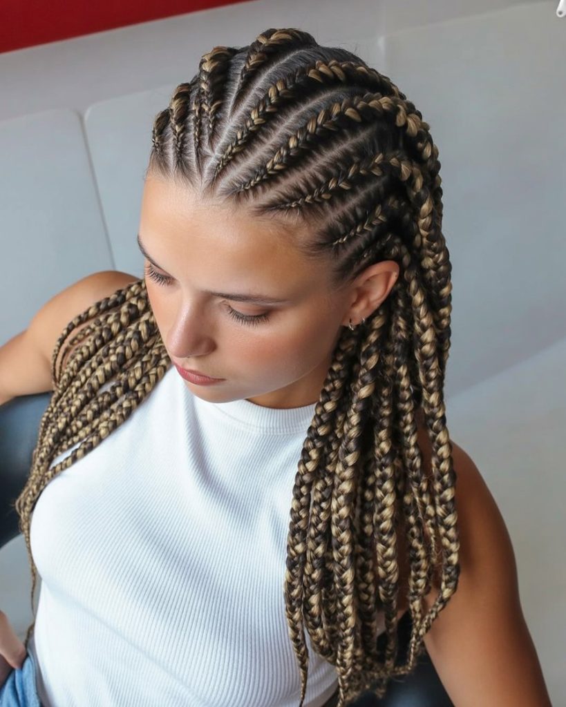 Subtle ribbons of honey weave through slim rows that rise and fall like soft waves across the scalp—clean, sculptural, and quietly luxe. The contrast between the warm highlights and the darker base gives dimension without shouting, so the style feels wearable from weekday meetings to weekend fun. If you love simple lines but still want interest, this is your sweet spot: neat at the crown, fluid through the lengths, and very 2026 for women who prefer polished designs that still feel alive.