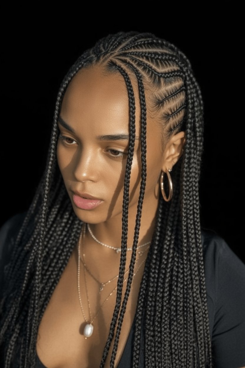 A gentle side sweep gives these braids a sultry angle, like your favorite over-the-shoulder pose made wearable. The pattern glides diagonally, slimming the profile and emphasizing cheekbones. It’s minimal yet magnetic—designs with natural hair energy that still feel polished for office days or nights out.