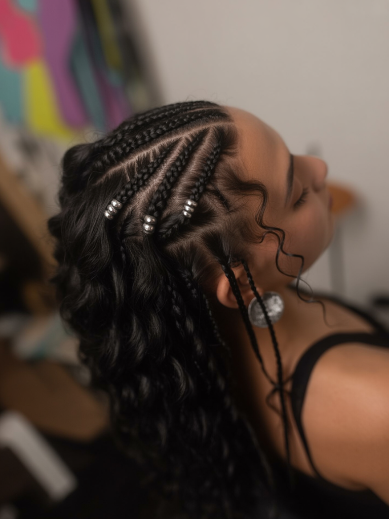A little sparkle changes everything. Metallic cuffs dot neat Fulani paths, while the back loosens into soft curls for that flirty, party-ready finish. The front tendrils frame the cheeks like posh jewels, addingmovement when you turn your head. It’s glam without trying too hard—Boho energy with red-lip confidence, perfect for dinners, concerts, or any night when you want your hair to whisper, “I have plans.”