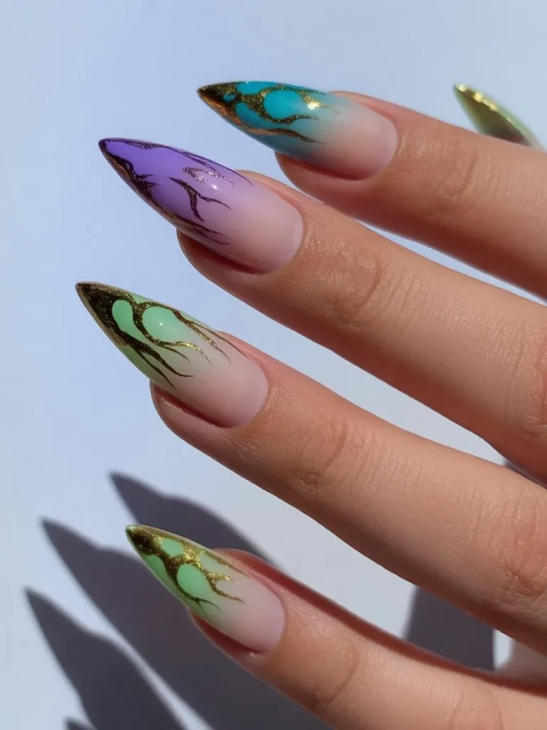 Stiletto nails elevate the elegance of this ombre Design. The glossy finish enhances the smooth transition of Color. It’s a polished take on spring nails for goth style.