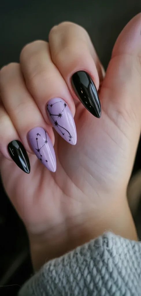 Soft lilac paired with glossy black and delicate constellation lines feels romantic and mysterious. The subtle star detailing adds refined sparkle.