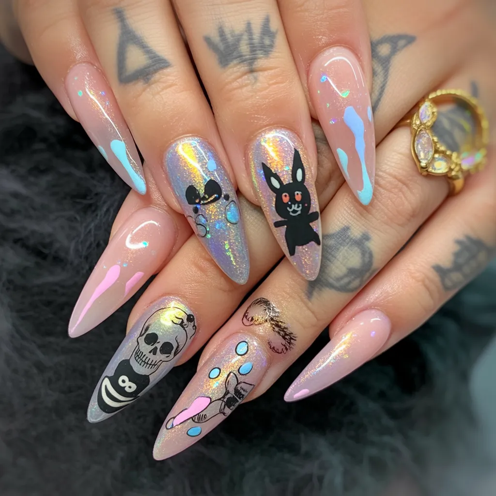 Holographic shine combined with playful gothic graphics creates a bold statement. The layered Art and shimmer catch the light from every angle.