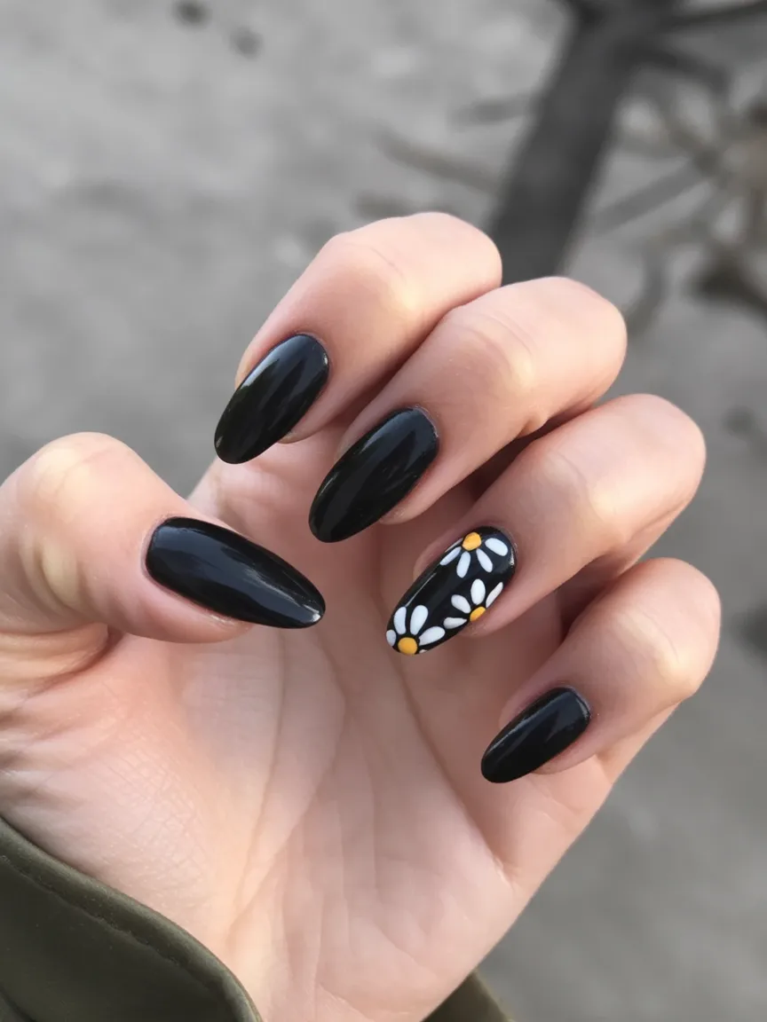There’s something so effortlessly chic about glossy black nails with a single daisy accent. It feels minimal, clean, and quietly cool. The tiny white petals with that pop of yellow bring a hint of spring brightness without overpowering the dark base. It’s simple, but it doesn’t fade into the background.