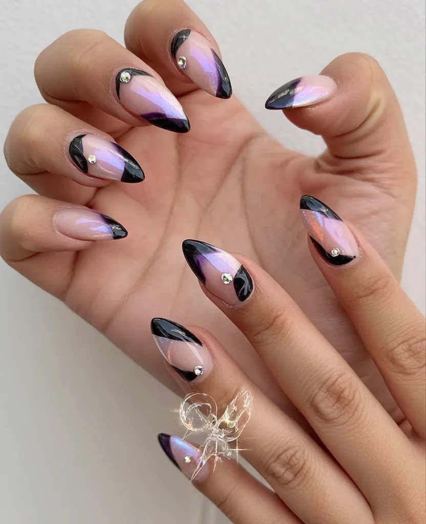 A modern french tip with black edges and iridescent shimmer feels elegant and polished. Tiny rhinestone accents add a touch of sparkle without overpowering the Design.