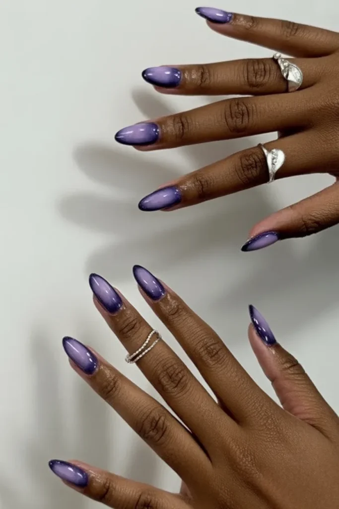 Deep violet fading into black creates a moody gradient that feels sophisticated and modern. It’s dramatic but softer than a full black manicure, making it ideal for spring 2026.
