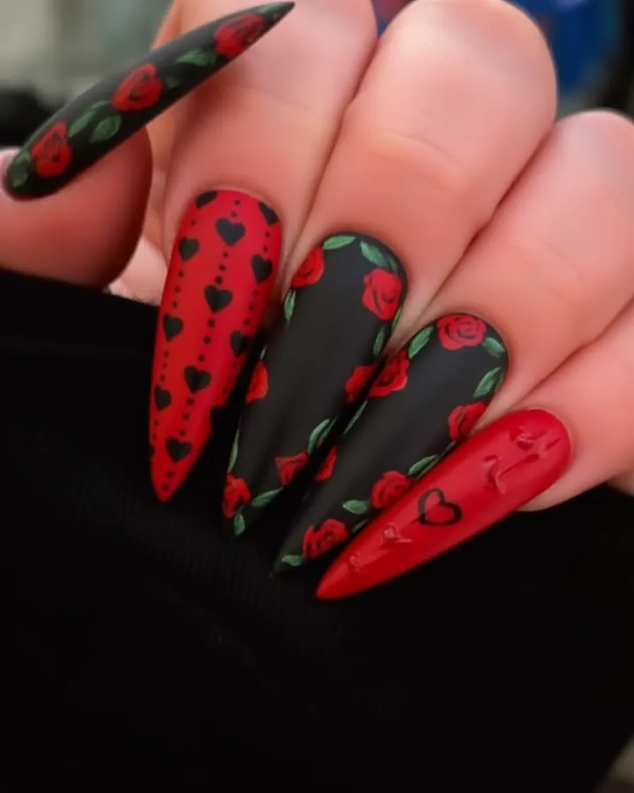 If classic romance had a darker, more confident sister, this would be her manicure. Bold red paired with matte black and scattered roses feels passionate, dramatic, and unapologetically feminine. The tiny heart details add just enough softness, while the rich Color contrast keeps everything grounded in true spring nails for goth energy. It’s sultry without trying too hard.