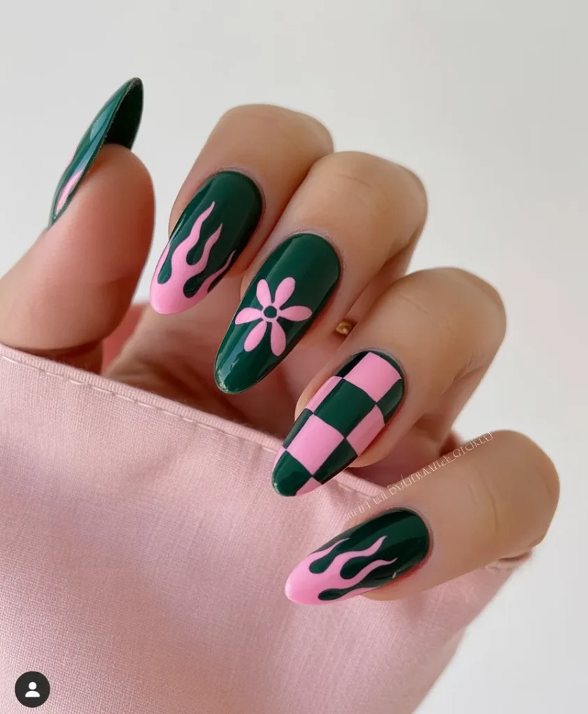 Deep forest green paired with soft pink flames and checkerboard accents feels graphic and playful. The unexpected Color combination makes this Design stand out beautifully in 2026.
