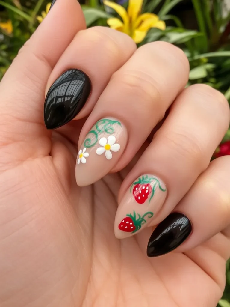 Black nails with delicate strawberries and daisies feel like a secret garden with a dark twist. The vibrant red fruit and crisp white petals add a refreshing spring vibe, while the black base keeps things grounded in goth territory.