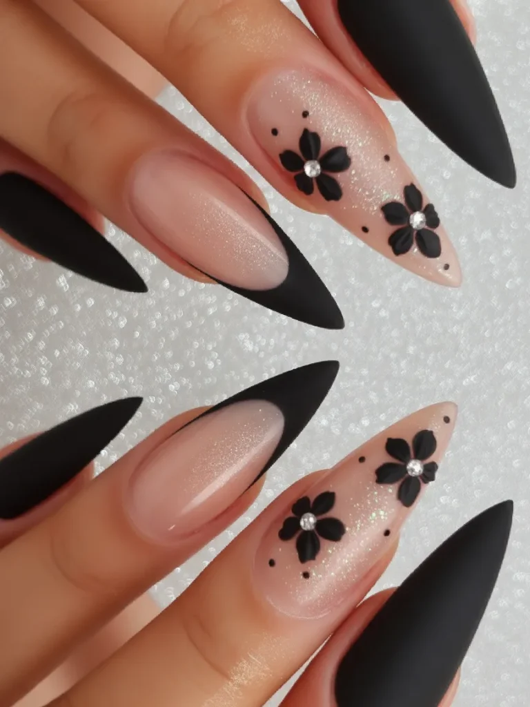 Matte black tips combined with a shimmering nude base and tiny floral details feel elegant yet edgy. The hint of sparkle underneath adds dimension, while the matte finish keeps everything grounded.
