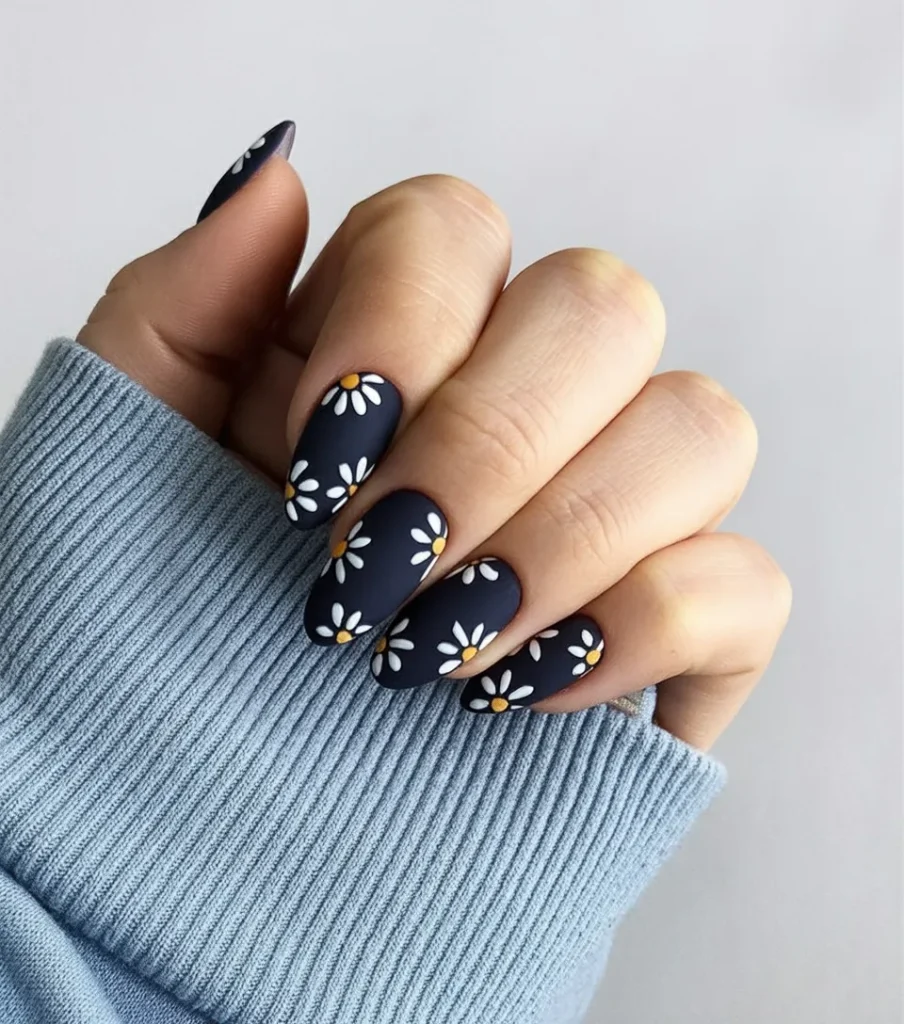 Deep navy with delicate daisies feels subtle and cozy. The matte finish softens the look, while the white petals brighten the dark base just enough.