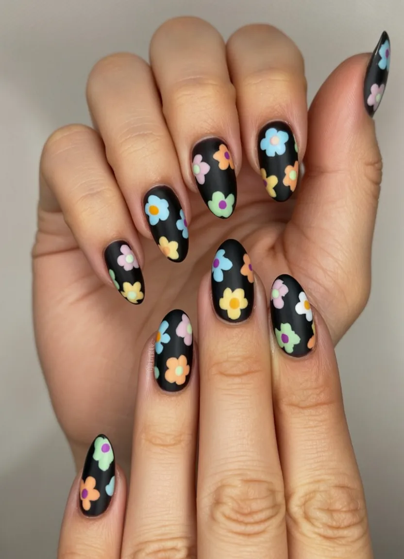 Matte black with tiny pastel flowers? That contrast is everything. It feels moody but playful at the same time, like pairing combat boots with a flowy dress. The Soft Pastel petals pop beautifully against the dark base, adding just enough whimsy to lighten the look.