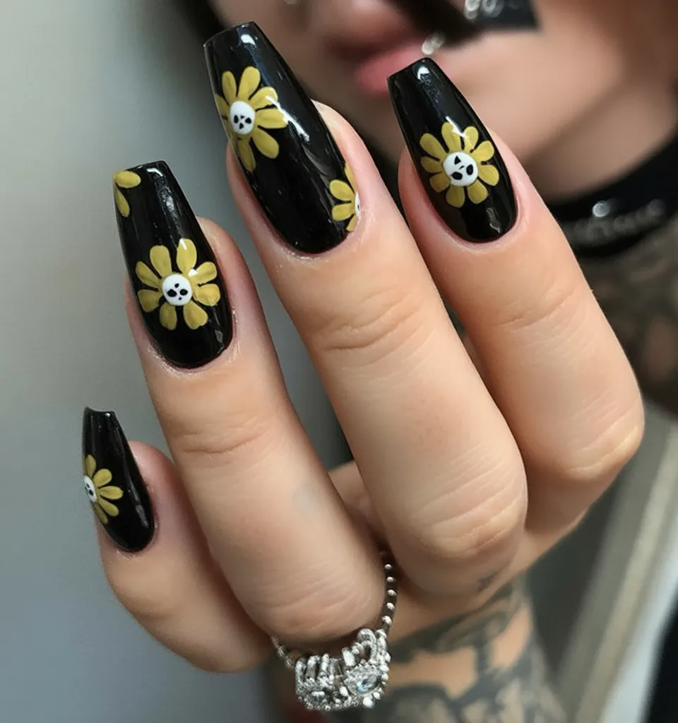 Yellow daisies with tiny skull centers on a glossy black base bring sunshine and shadow together beautifully. It’s bold, playful, and confident.