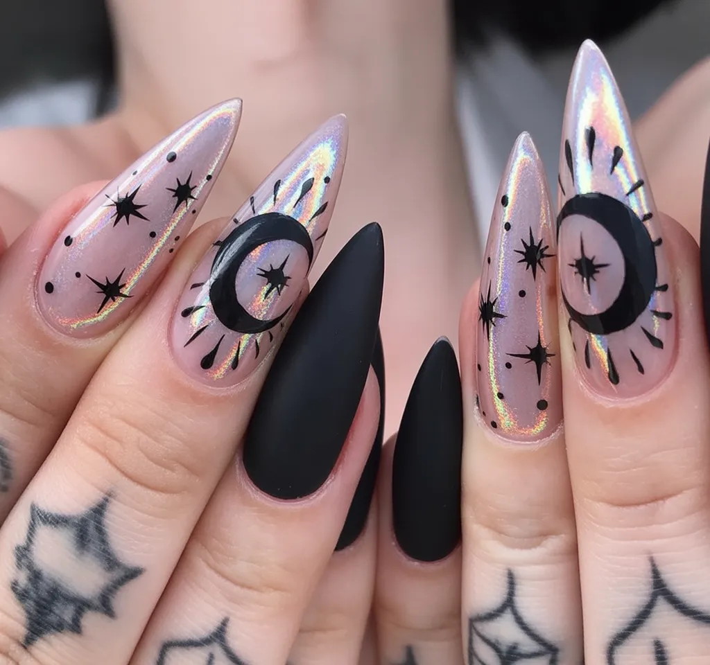 Iridescent shimmer paired with bold black moons and stars creates a cosmic statement. The holographic glow catches the light beautifully, while the dark symbols keep the overall vibe grounded and mysterious.