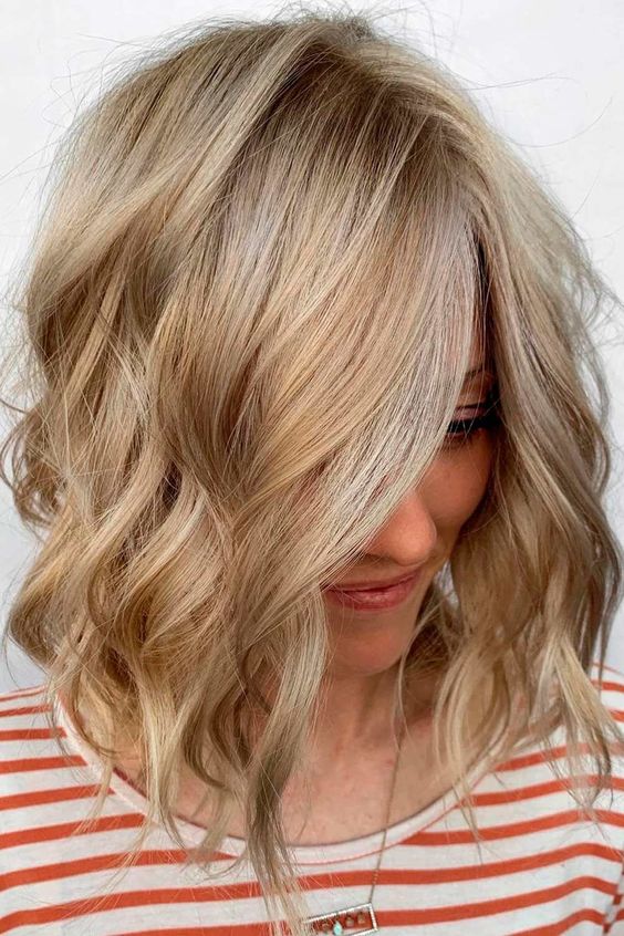 A wavy lob brings a softer, more romantic feel to the shoulder length cut. It’s easy to style and universally flattering.