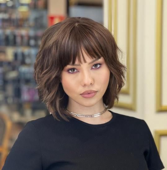 A playful, tousled shaggy bob featuring textured layers and light bangs. This cut adds volume and movement, creating a soft and relaxed look. Ideal for adding a bit of flair, this style works well for casual and semi-formal settings.
