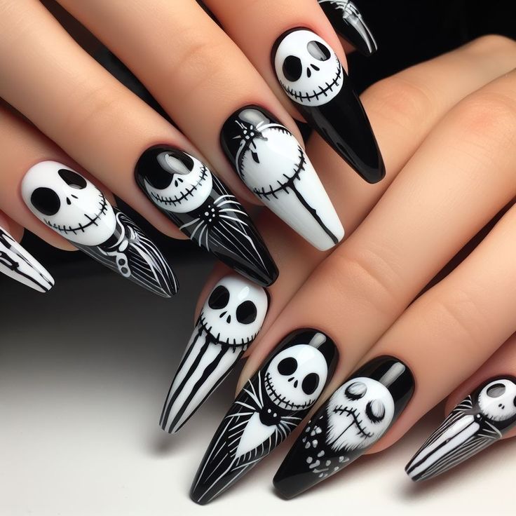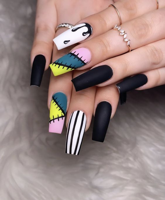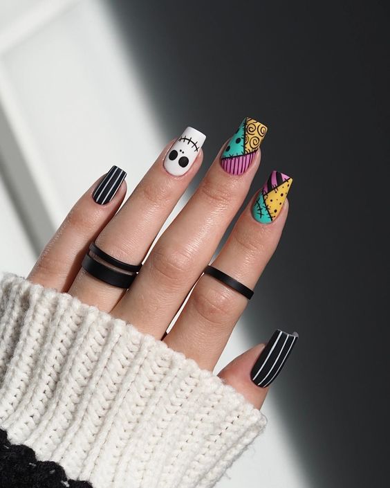 For all the Disney lovers out there, this Jack Skellington-inspired design is a must-try. The nails are a mix of square and almond shapes, painted in bold stripes and the iconic patchwork pattern of Sally from “The Nightmare Before Christmas.” The design is both funky and classy, making it perfect for anyone looking to add a bit of Disney Inspo to their Halloween look. The black and white base, paired with bright pops of orange and green, keeps the design festive and fun, yet easy to wear.