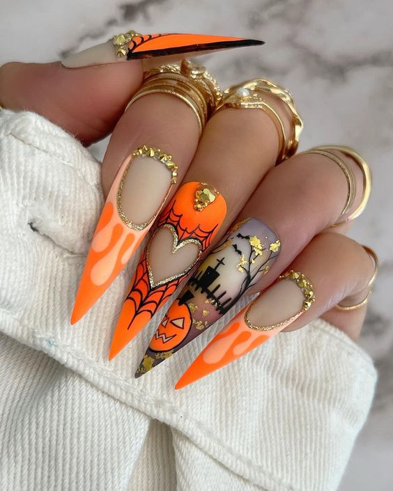 This almond-shaped design is a fiery mix of orange flames and intricate gold accents, perfect for those who want to make a bold statement. The nails feature sharp, pointed tips, with the orange flames giving off a vibrant, eye-catching look. The addition of gold glitter around the cuticles adds a touch of classy elegance, while the heart-shaped negative space and spooky haunted house design tie in the Halloween theme. These nails are ideal for someone looking to mix funky and elegant styles.