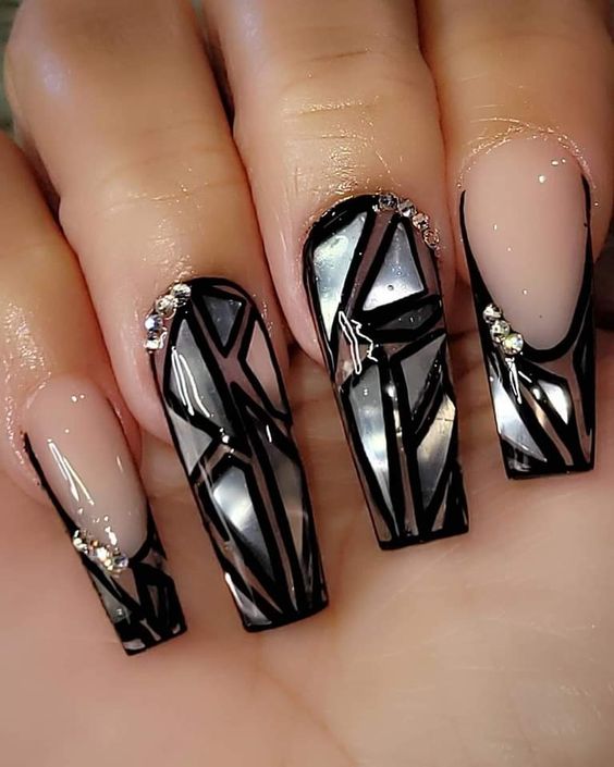 If you prefer a more elegant and sophisticated look, these black geometric nails are a must-try. The square shape provides a clean canvas for the sharp, angular designs that give off a modern, chic vibe. The addition of subtle rhinestones adds a touch of sparkle without overwhelming the design. This look is perfect for a classy Halloween party or any fall event where you want to impress with your stylish nails.
