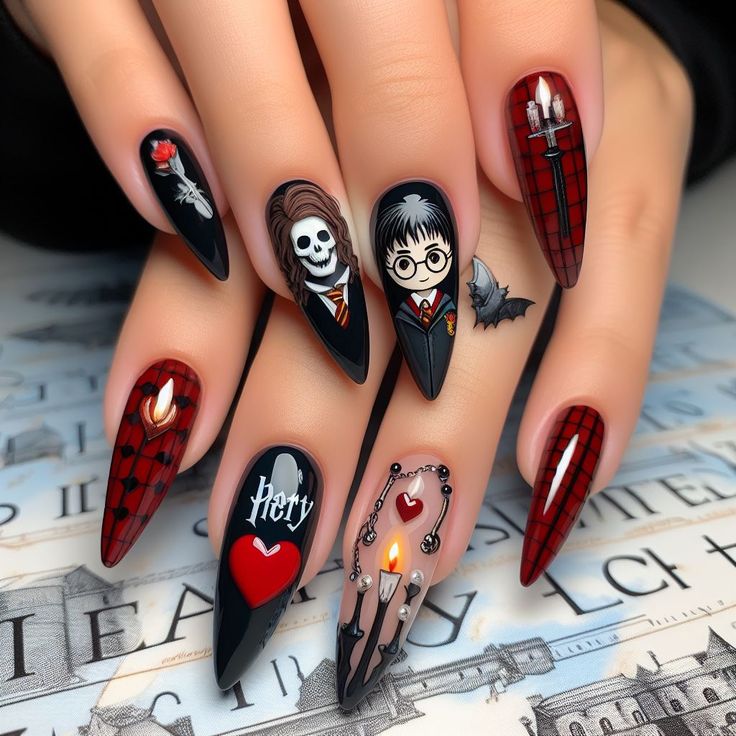 For the ultimate Harry Potter fan, these nails are a magical addition to your Halloween ensemble. Featuring detailed artwork of iconic symbols and characters from the series, including Harry himself, these almond-shaped nails are both fun and edgy. The mix of deep red and black tones with fine line details makes this design not only a nod to the beloved series but also a standout Halloween look.