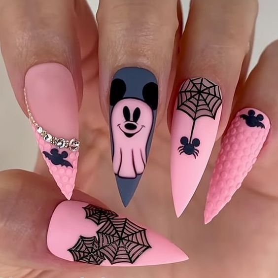 Who says Halloween nails can’t be pink? This almond-shaped design features a playful mix of pink hues with spooky spider webs and a ghostly Mickey Mouse. The matte finish adds a classy touch, while the rhinestone details bring in some funky flair. This design is perfect for someone who wants to celebrate Halloween in a unique, fun, and casual way while still staying true to a feminine aesthetic.