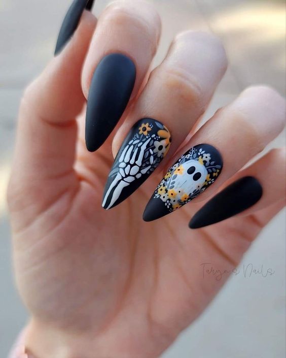 Matte black nails are a classic choice for Halloween, and this design adds a unique twist with intricate floral skeleton artwork. The almond shape elongates the fingers, while the combination of delicate flowers and skeletal designs makes this look both elegant and edgy. It’s an ideal choice for someone looking to balance classy and funky in their Halloween look.