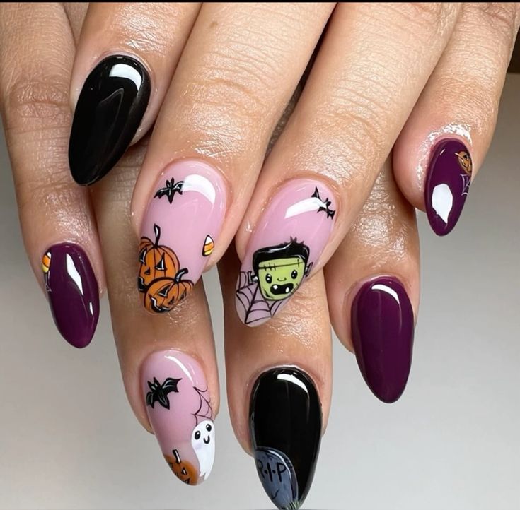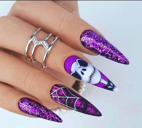 Nothing says Halloween like a touch of sparkle mixed with spooky elements. These nails feature purple glitter paired with detailed skeleton designs, making them perfect for those who love to go all out. The almond shape adds a classy touch, while the glitter and skeleton motif keep the design fun and funky. Whether you’re attending a Halloween party or just want to embrace the season, these nails are sure to be a hit.