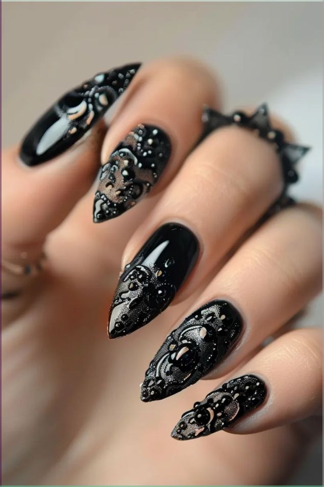 This design is the epitome of elegance and edgy style. The nails feature a deep black base, adorned with intricate lace patterns that are further embellished with rhinestones. The almond shape adds a touch of classy femininity, while the lace and rhinestone details bring in the perfect amount of Halloween drama. These nails are ideal for those who want a classy yet funky look that’s still sophisticated enough for a night out.