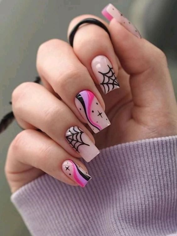 Combining pink and black with spider web designs, this square-shaped nail art is a trendy and funky way to celebrate Halloween. The mix of pink swirls with black webs adds a unique twist to the typical Halloween colors, making this design perfect for someone who loves to stand out. The glossy finish gives these nails a polished look, ideal for both casual outings and Halloween parties.