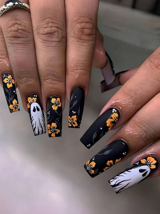 Combining the eerie with the beautiful, these nails feature a black base with ghostly white figures surrounded by delicate orange flowers. The mix of fall colors with a Halloween theme makes this design both seasonal and stylish. The square shape keeps it simple and easy to wear, while the intricate floral details add a touch of elegance. This design is perfect for someone who wants a more casual and fun Halloween look without sacrificing style.