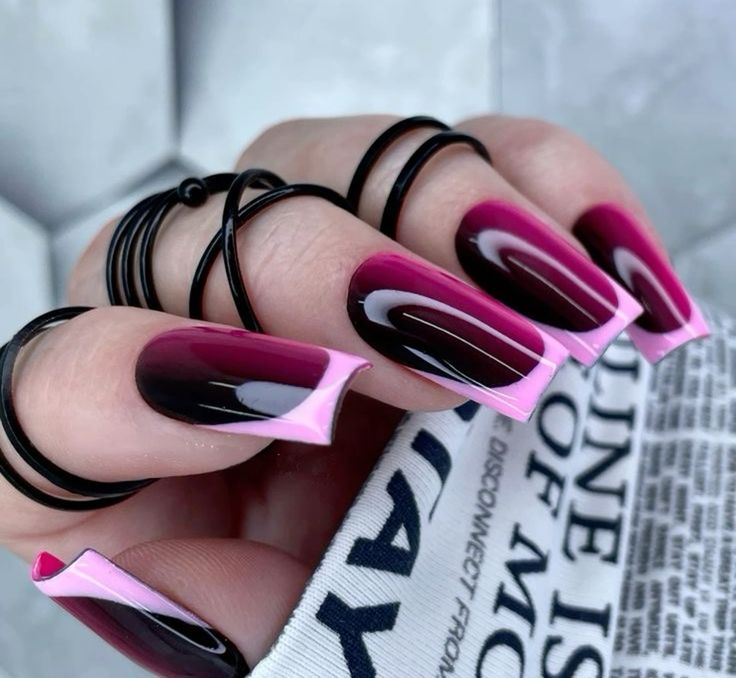 For those who prefer something more subtle yet still on-trend, this pink and black ombre design with a modern French tip twist is the way to go. The square shape nails feature a gradient from deep black to vibrant pink, with the tips highlighted in a soft pink. The look is both funky and classy, perfect for anyone who wants a Halloween-inspired design that can easily transition into everyday wear.