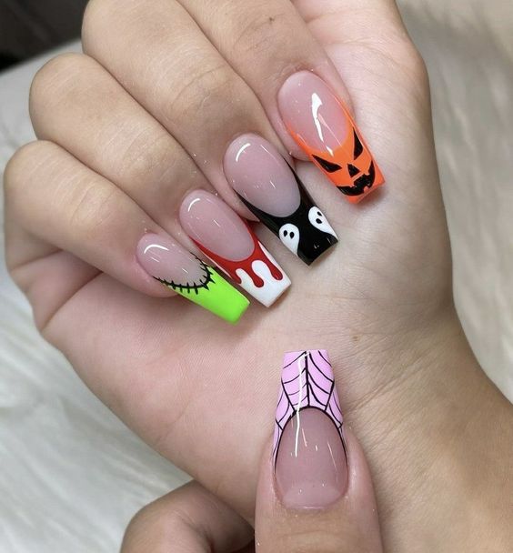 If you love a casual and fun vibe, this playful mix of different Halloween designs is for you. From dripping blood to cute little ghosts and pumpkins, these nails are the perfect way to showcase multiple Halloween elements at once. The square shape nails are ideal for displaying detailed nail art, and the combination of bright colors and simple designs makes this look both approachable and stylish.