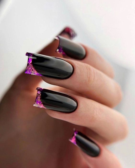 For those who prefer a minimalist yet funky approach, these black nails with purple glitter tips are the perfect blend of subtlety and sparkle. The square shape adds a modern twist, while the glittery tips keep the design festive and fun. This look is ideal for anyone who wants to celebrate Halloween in a more understated yet still stylish way.