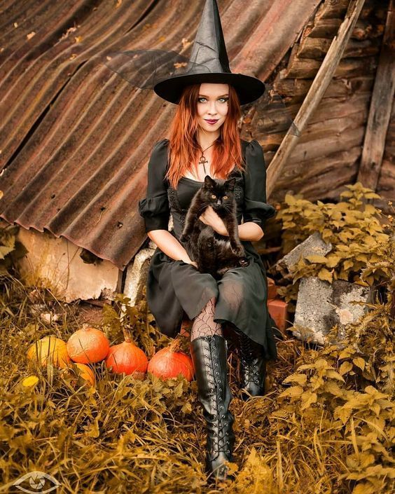 Embrace the classic witch look with a modern twist in this enchanting outfit. A long, black dress with a cinched waist creates a flattering silhouette, while the pointed witch hat adds a touch of iconic Halloween style. The addition of a black cat accessory and pumpkins around gives the perfect aesthetic for those who want to channel their inner witch this Halloween. This outfit is ideal for those who love a bit of fantasy and magic. For a standout look, opt for lace or velvet details and pair it with knee-high boots. It’s a timeless choice that never goes out of style, making it perfect for women looking to embody the mysterious and powerful witch persona.